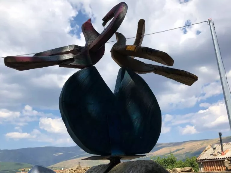 Son obras con su particular estilo que unen formas abstractas y de la naturaleza, utilizando básicamente maderas y materiales de la tierra que conoce desde niño, con los que convivió en su infancia. Una localidad de la comarca del Aravalle que no supera los 15 habitantes en invierno, recibe decenas de veraneantes en época estival, a los que se han unido ahora quienes quieren recorrer las esculturas entre sus calles.
